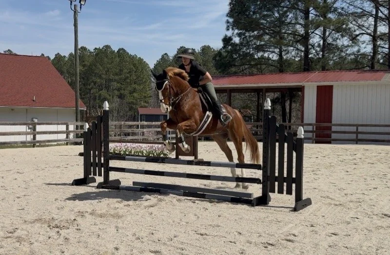 Falcon is very pleasant to ride. He goes on the bit nicely, moves off of aids great and gives his rider a great feeling over fences. He has been introduced to jump fillers and didn’t bat an eye at them. He has more go than whoah, but listens to aids very well.. Suitable for a rider who has an educated seat, leg and hands. He is very easy to hack and does well alone or with others.